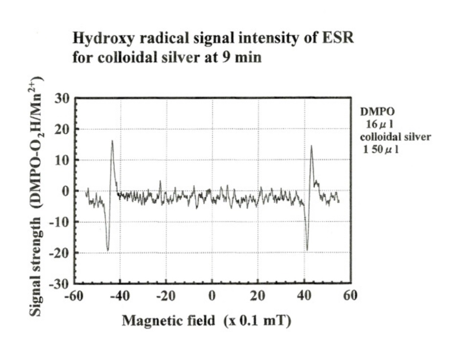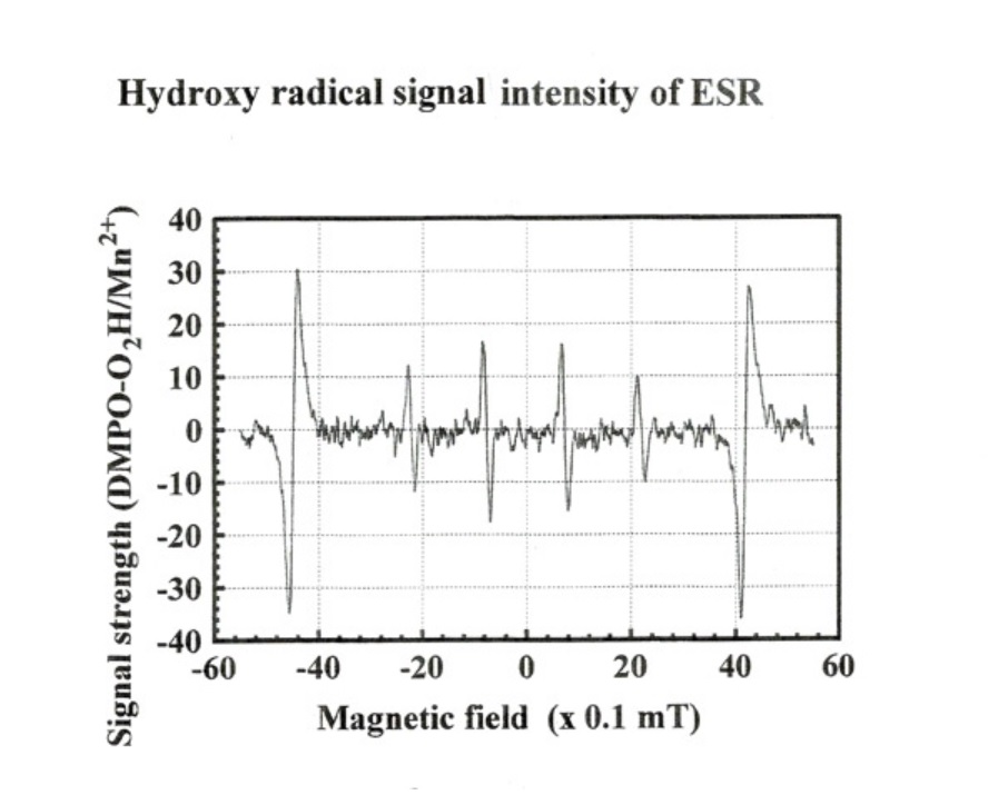 電解陰極水に銀イオンを添加してヒドロキシラジカルの抗酸化作用を電子スピン共鳴装置(ESR)で求めると、上記のように中和作業が認められました。(自社調べ)つまりヒドロキシラジカルは、次の式により水酸化物イオン(OH-)に還元され中和されることが考えられます。『酸化還元反応とは何か』より
